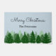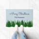 Elegant custom doormat features "Merry Christmas" and your family name on a snowy background with pine trees. Personalize with your family's last name.