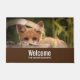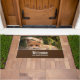 Un tapis de bienvenue avec une photo de chéri représentant un petit renard orange qui vous regarde derrière une sortie dans le désert.