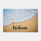 Tapis de bienvenue avec une photo d'une plage de sable brun doré au surf mousse blanc.