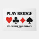 Montrez votre sens de l'humour du pont en double avec ce tapis de porte avec les quatre costumes de carte ainsi que le dicton "Play Bridge C'est moins cher que la thérapie". Faites les autres faire un double-prendre la prochaine fois que vous jouez au pont avec ce pont mémorable disant tapis de porte! Porte d'humour de pont mémorable pour n'importe quel club de pont.