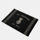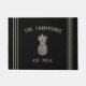 Bienvenue dans votre demeure avec ce charmant tapis de portes rustique de style ferme. Le design personnalisé comprend votre nom de famille ou votre nom de ferme en lettres brunes neutres, ainsi que votre année d'établissement et une illustration d'ananas. La bande de corde détaillant un riche arrière - plan noir complète la conception.