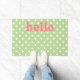 Le mat de porte personnalisé mignon comporte des pois blancs sur un arrière - plan de vert menthe doux. Personnalisez avec votre choix de salutation spéciale en Coral Pink.
