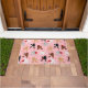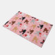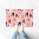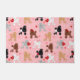 Cute Valentine's Day Poodles with in black, white, gray, apricot and brown color coats wearing red, pink, and white polka dot and heart sweaters with scattered paw prints and arrow on a pink background.