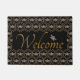 Ce tapis de bienvenue contemporain présente un motif de ruche géométrique couleur or, des bourdons et un arrière - plan noir.