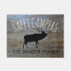 Cadeau rustique mignon de décor de camping pour des rvers, des couples retirés, des randonneurs, des campeurs, et des amants de nature. Natte en bois personnalisée et rustique de regard qui indiquent des profondément satisfaits avec un modèle pour ajouter le nom de famille au fond dans les lettres noires, ou les quelque couleur ou style vous marquant avec des lettres préférez. Au milieu est une ombre d'un élan avec pièce du support de ses andouillers la" des lettres supérieures. Contre une photo d'arrière - plan vieux de bois rustique et affligé. Cadeau unique de retraite, aussi. Soyez droit à la maison devant un rv ou un cabine de rondin confortable.
