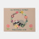 Voici un tapis de porte mignon qui comporte une image de style de boho d'un petit raton laveur heureux se situant dans une guirlande florale colorée. À chaque fond le coin est une fleur rose lumineuse. Au dessus et au bas de l'image est votre texte fait sur commande en assortissant le vert turquoise. L'image et le texte sont placés sur un fond bronzage clair pour les faire vraiment se tenir ! Là assortissent des produits avec cette conception dans notre magasin.