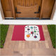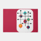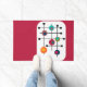Ce tapis de portes a un design moderne du milieu du siècle d'un rectangle magenta avec un rectangle blanc au fond avec une grille noire avec des cercles rétro dessus.