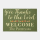 Bienvenue à la saison d'automne et impressionne vos invités avec ce tapis de porte personnalisé sur le thème de l'automne avec l'écriture biblique édifiante de Psaume 136:3 : "Remerciez le Seigneur." Ce tapis de porte Thanksgiving, joliment conçu, présente d'élégantes calligraphies de script crème pour le verset, jumelé à de charmants éléments d'automne comme des glands, des feuilles d'érable rouge, jaune et orange vibrants et des citrouilles. Le bas contient le mot "Welcome" et votre nom de famille personnalisé en police de bloc crème, le tout placé contre un riche arrière - plan vert mousse ou vert kombu. Parfait pour ajouter de la chaleur et du style à votre décor extérieur d'automne ou comme une décoration Thanksgiving réfléchie. Idéal pour les entrées, les porches ou les portes d'entrée, ce tapis de porte personnalisable apporte à la fois beauté et une touche accueillante à votre maison cet automne.