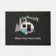 Tapis de caméra avec le slogan inspirant "Life Rocks When Your Home Rolls", qui peut être édité à vos propres mots. Imprimé sur une scène arrière - plan noire d'une remorque de voyage vintage en jambon en conserve en bleu et crème sous la lune et les étoiles. Voir plus dans cette collection à Camp_and_Cottage sur Zazzle.