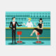 Chaque heure est l'heure heureuse avec ce Retro Cocktail Lounge Porte Mat. Le design moderne du milieu du siècle présente un dessin animé minimaliste et animé de style années 1960 d'un bar à cocktails élégant. Sur fond de mur d'aqua, on peut voir des rangées de verres de boisson. Au moins, on peut voir les silhouettes turquoises des lunettes de boisson. A en juger par les formes de la tige, ce bar est bien équipé pour mouiller votre sifflet, quelle que soit votre préférence de boisson. Un barman des plus compétents et personnalisables est le bar turquoise aux accents jaunes. Le jeune bardonte porte une chemise blanche immaculée avec cravate arc noir. Son apparence fraîche, ses cheveux blonds et ses lunettes noires de hipster nous donnent toutes les raisons de croire qu'il passe ses journées en tant qu'acteur en difficulté ou en tant que super-héros. D'un côté, le beau mixologiste donne un martini à un client de l'autre côté du bar. Le client en attente est un gentleman à larges épaules en costume noir et cravate rouge. C'est le genre de gars qui est décrit comme grand, sombre et beau même quand il reste des heures jusqu'à la fermeture. Il semble y avoir un tabouret rouge et chrome avec le nom de M. Debonair dessus. Mais pour ne pas être présomptueux, il pose la question : "Pardonnez-moi. Est-ce que ce siège est pris ?" Il demande à la fille aux cheveux raven sur le tabouret du bar voisin. C'est une vraie "fille d'à côté", si vous vivez à côté d'une beauté impeccable avec un personnage qui ne démissionnera pas. Elle porte une robe noire et tient un martini d'une main. Elle espère qu'elle et l'homme approchant ont plus en commun que leur préférence pour la boisson et le choix de la couleur de l'armoire. On dirait que ce soir est devenu intéressant. Bravo !