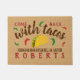 " Reviennent avec le texte de tacos" avec une illustration de taco, des poivrons verts et rouges, et votre nom de famille - arrière - plan de toile de jute de faux - la natte parfaite pour des fins gourmets