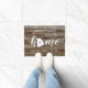 Montrez un peu de fierté de l'état de la maison avec ce mignon tapis rustique en faux bois porte "maison" en écriture calligraphique blanche avec une carte silhouette de l'état de Rhode Island debout pour la lettre "O." Une illustration de coeur rose à l'intérieur de la carte d'état complète la conception; vous pouvez changer la position du coeur à votre ville d'origine en ouvrant l'outil de conception et en faisant glisser la forme du coeur à votre endroit préféré. Personnalisez avec votre ville natale, nom de famille et année établie pour créer une touche de finition parfaite pour votre porte d'entrée, ou un cadeau inoubliable de chauffage domestique.