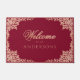 Un design élégant bordeaux et rose avec des branches complexes avec des feuilles de rose gold dans les coins. Le mot Accueil est également en calligraphie rose gold, le nom de famille en dessous en majuscules. Le texte est "Bienvenue chez les [Nom de Famille]" Le fond est bordeaux.