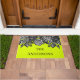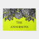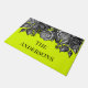 Ce tapis de bienvenue cool est prêt à être personnalisé avec le nom de votre famille ou tout texte que vous voulez. Ce tapis de porte présente des illustrations de roses noires et blanches dans un style de gravure antique contre un arrière - plan de couleur vert citron électrique.