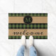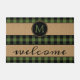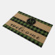 Paillasson amusant avec motif en plaid contemporain noir et vert à damiers sur arrière - plan burlap. Design rustique élégant et unique avec chambre pour customiser ou personnaliser avec votre nom de famille monogramme. Décor extérieur monogrammé original accent pour décorer la véranda ou la cour de votre maison de campagne, cabine en rondins, chalet de montagne, camp de pêche, lac ou maison de vacances en rivière.