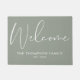 An elegant sage green doormat featuring beautiful script calligraphy welcome and personalized with your family name and special date. Designed by Thisisnotme©