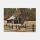 Une photographie d'une scène de pays comportant une grange patinée et une barrière de rail cassée.