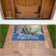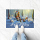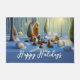 Le tapis de portes avant de vacances amusant la scène de Noël fantasque et surréaliste avec des arbres enneigés, créé avec un logiciel générateur d'IA. Le texte "Happy Holidays" sur arrière - plan bleu est personnalisable.