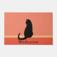 Des nuances de pêche et d'orange ainsi qu'une représentation graphique d'une silhouette d'un chat noir assis devant la porte. Le mot WELCOME est placé en dessous de l'image en noir moderne pour accueillir les invités.