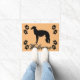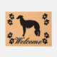 Silken Windhound silhouette avec empreintes de pattes et texte "Welcome" en noir.