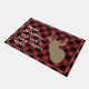 "S'il vous plaît, soyez un cerf.....Et laissez vos chaussures ici" texte blanc sur un arrière - plan en plaid rouge et noir avec une silhouette de cerf inspirée du burlap à droite.