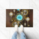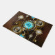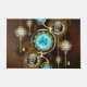 Turquoise lenses with antique watch with brass gears and golden keys on rusty, brown background. Steampunk style.
