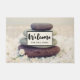 Un paillasson de bienvenue avec une photo avec des piles de rochers sur les deux. Entouré de rochers blancs et de petites fleurs blanches.