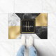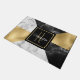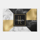 Un tapis de porte d'inspiration Art Déco, réalisé dans un motif géométrique de papier doré, de marbre blanc et de marbre noir. Un carré noir et or, au milieu, a un monogramme jaune doré et un texte blanc prêt à être personnalisé. Joli décor maison et fait une idée de cadeau.