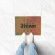A variety of orange shaded lotus mandalas on a green and orange backdrop with a black damask design in the center where the word welcome is centered. Stylish welcoming vibes