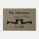 Tapis de porte avec les silhouettes noires de teckel sur un fond de texture de brun de toile. Les coeurs de flottement montrent les doxies dans l'amour. Personnaliser avec votre nom et année de mariage.