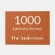 Le numéro de la maison et le nom de la rue sont au-dessus du texte pour votre nom de famille ou message personnalisé sur ce tapis de porte en terre cuite. Le texte est beige. Tout le texte peut être modifié ou supprimé