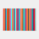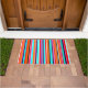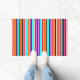 Ce tapis de porte a un design simple de bandes verticales de différentes épaisseurs en rouge, orange, violet, noir, bleu clair et blanc.