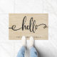 Cette natte comporte un arrière - plan rustique et de toile de regard de toile de jute et une typographie noire moderne qui indique "bonjour".