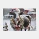 Une vache Holstein se dresse dans un paysage enneigé orné d'une couronne de Noël autour du cou illuminé par des lumières douces