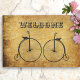 Tapis de bienvenue au design vintage pour un couple. Deux bicyclettes à cent pour cent sont imprimées sur une image arrière - plan en papier parchemin en détresse. Le texte "Bienvenue" est en noir dans la police de lettres ouvertes. Ce design original et à l'ancienne est parfait pour un couple actif à vélo.