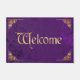 Ce tapis d'accueil au style vintage présente un design ancien en violet et or. Le tapis est orné d'un arrière - plan design en velours violet aux accents ornés et gothiques d'angle doré. L'accueil "Welcome" est imprimé dans une police de style médiéval avec un motif en feuille d'or qui correspond aux accents d'angle doré.