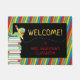 Ce paillasson de classe comporte un ver de livres tenant un crayon et assis sur une pile de livres. L'arrière - plan est un motif à bandes diagonales coloré. Le texte personnalisé vous permet de personnaliser ce mignon tapis de porte enseignant.