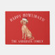 Paillasson de Noël adorable avec un Vizsla Dog hongrois portant un chapeau santa sur un arrière - plan rouge festif.