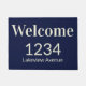 L'accueil est au-dessus du numéro de la maison et du nom de la rue sur ce sombres tapis bleu minuit. Le texte est beige. Vous pouvez modifier le texte pour afficher votre adresse de rue ou un message personnalisé.