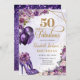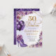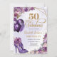 Invitation pour une fête d'anniversaire 50 ans fabuleuse, conçue dans un style luxueux et élégant. Le point central du design est le nombre "50" et le mot "Fabuleux", tous deux rendus dans une texture de paillettes dorées scintillantes et une police de caractères élégante. Des arrangements floraux présentant un mélange de fleurs violettes, mauves et roses, y compris des roses et d'autres fleurs. Une paire de talons hauts violets scintillants est ornée d'un bouquet de fleurs assorties, et une paire de talons hauts violets scintillants est ornée d'un bouquet de fleurs assorties,