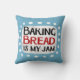 "Baking Bread Is My Jam" est un design de texte mignon en bleu avec du texte en noir et rouge, avec une forme d'accent blanc et des points blancs texturés blancs qui l'entourent.