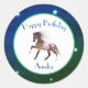 Paint Horse Stars Joyeux Anniversaire Personnalisé bleu / vert autocollants. Ces autocollants sont très bons en eux-mêmes ou dans le cadre d'un thème avec nos plaques en papier assorties, serviettes et sacs de fête.