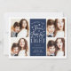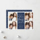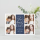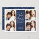Hanoukka carte photo, basé sur la typographie moderne, présente quatre de vos photos préférées au format carré, avec "Paix, Amour et Lumière" centré sur la typographie de style lettré blanc. Personnalisez avec votre nom de famille, vos noms individuels et/ou votre message personnalisé. Les cartes sont retournées à un motif de neige blanche et d'étoiles jaunes sur un arrière - plan bleu marine.