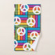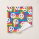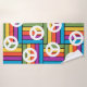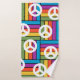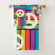 Ce kit de serviettes a un design carré formé de rectangles en bleu, violet, orange, jaune et vert avec des panneaux de tranquillité éparpillés sur le dessus.