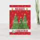 Comporte un arrière - plan rouge et des mots "Joyeux Noël", arbres verts, étoiles de jaune, étiquettes de chien, flocons de neige et les mots, "paix sur terre", en manuscrit blanc.
