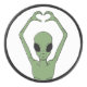 Vivid green alien forming a heart with arched arms against black, blending sci-fi whimsy with playful charm. Bold contrast, perfect for space fans and quirky casual outfits.
