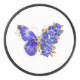 Bijoux, bleu, saphir, papillon aux fleurs pétillantes avec aile décorée de bleu, fleurs précieuses avec feuilles d'or sur arrière - plan blanc.