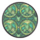Sous-verre rond présentant un motif floral vibrant avec des feuilles vertes et des motifs circulaires. La vue latérale montre un bord noir texturé, ajoutant du contraste.