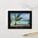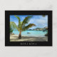 Carte postale d'un palmier sur la plage de sable d'une luxueuse station de lune de miel surplombant l'eau sur l'île tropicale Bora Bora, près de Tahiti dans l'archipel pacifique Polynésie française avec une frontière noire et le texte : 'Bora Bora'.