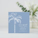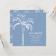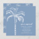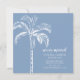 Faire-part tropicale mobile avec un palmier posé sur un arrière - plan bleu avec un palmier de coordination.